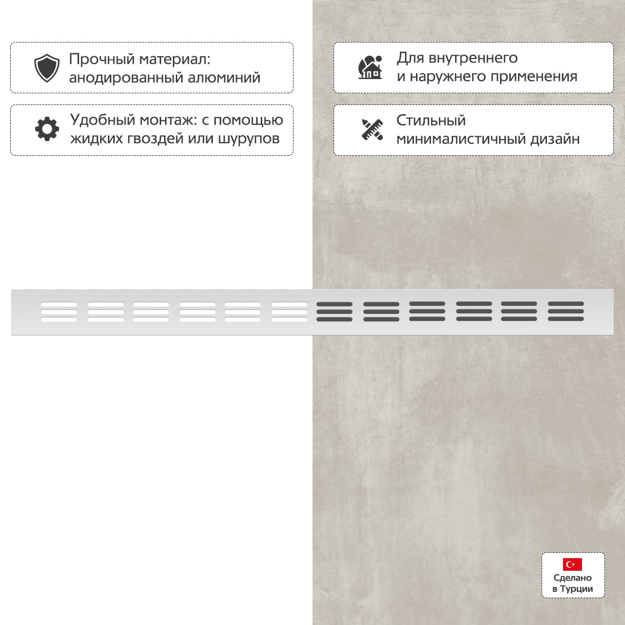 • Удобное крепление при помощи шурупов или жидких гвоздей
