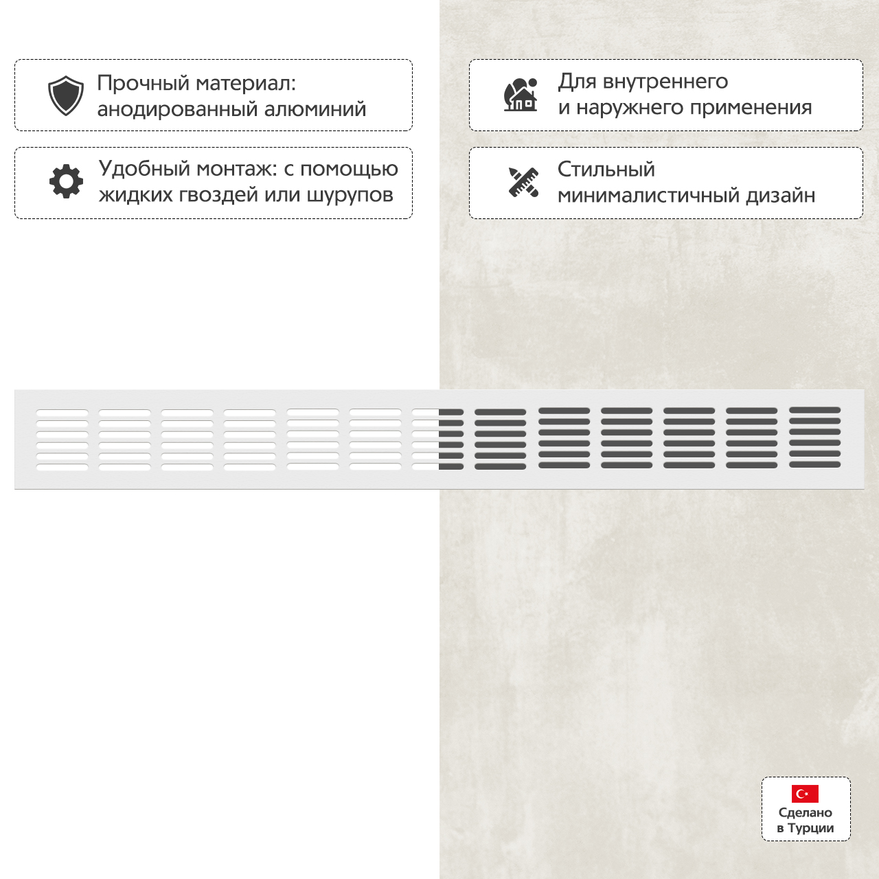 Прямоугольная вентиляционная решетка изготовлена из анодированного алюминия.