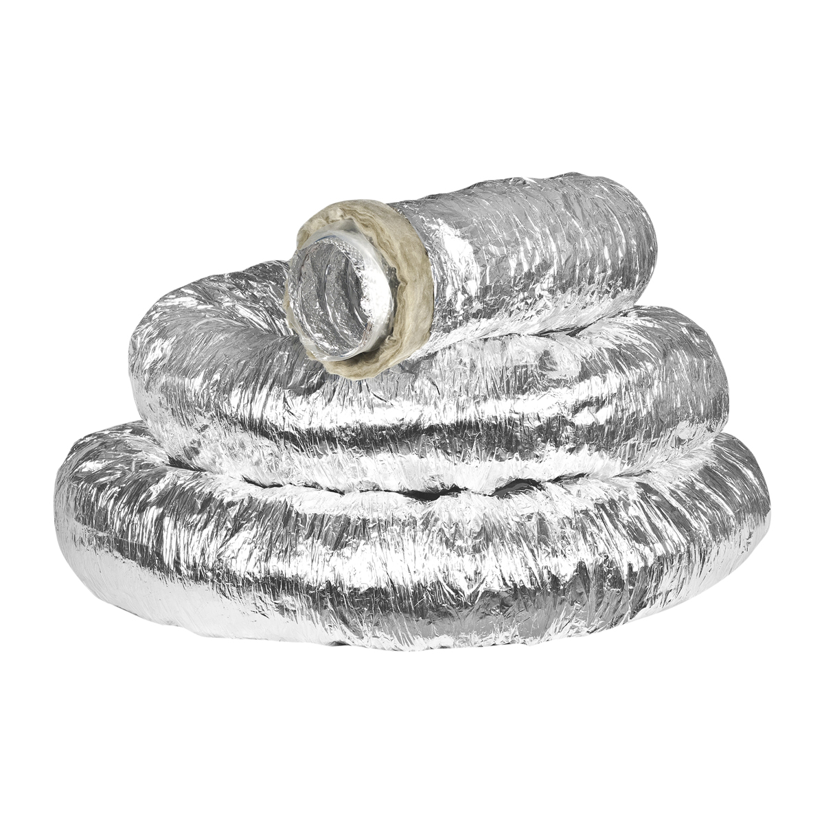 Шумоизоляционный слой без стыков, волокно имеет равномерный нахлест. При монтаже он не раскрывается, не образуются незащищенные зоны. Как следствие не ухудшается качество звукоизоляции.Наружный слой из алюминия, ламинированного полиэстером, надежно защищает изоляционный материал и внутренний воздуховод от деформации, нарушения целостности.